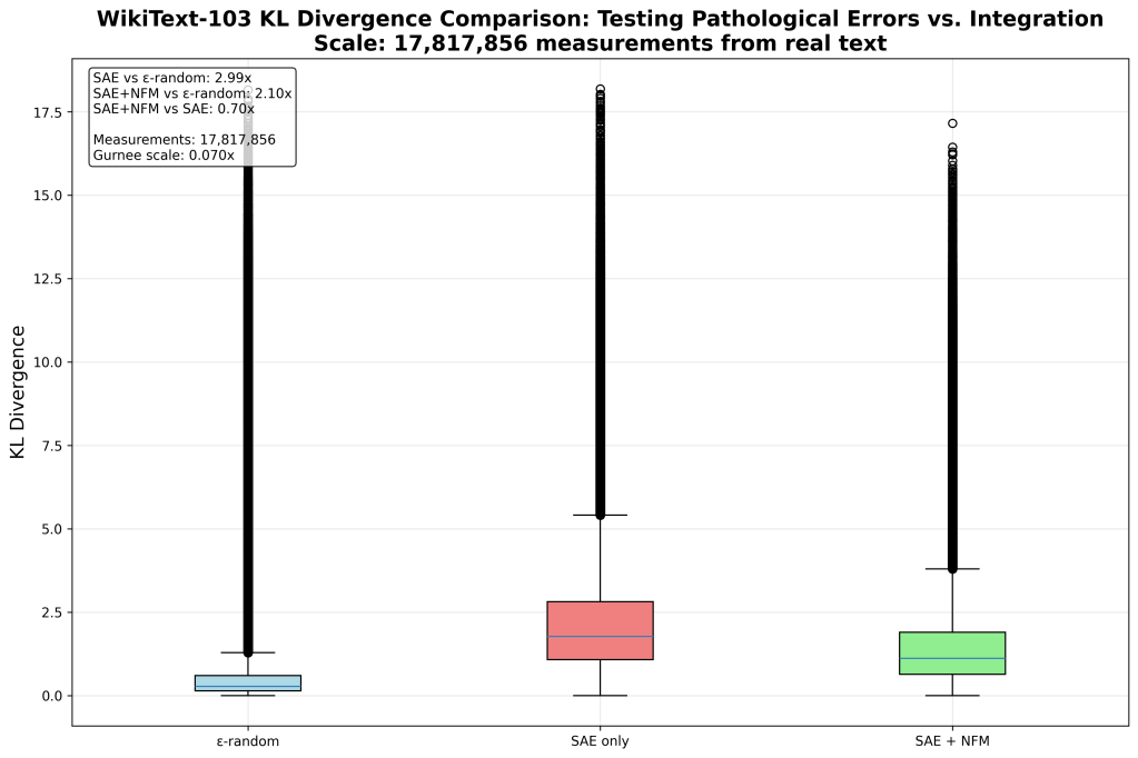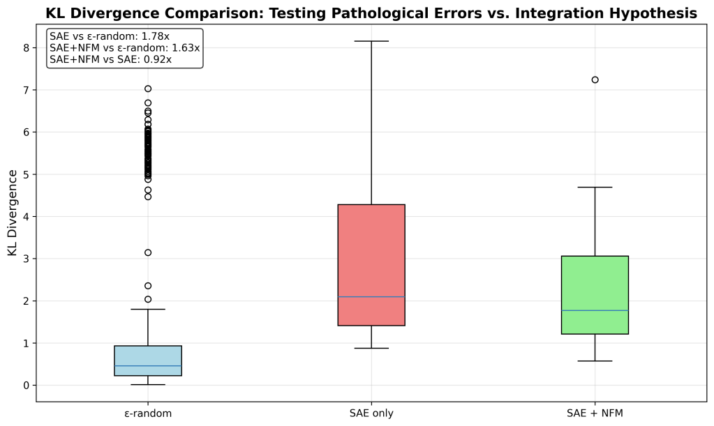 “Feature Integration” reduces pathological errors by about 8.5% as measured by KL Divergence. For reference, the “Feature Integration” SAE (NFM + SAE) has about a ~23% reduction in reconstruction loss error compared to the classical SAE approach.