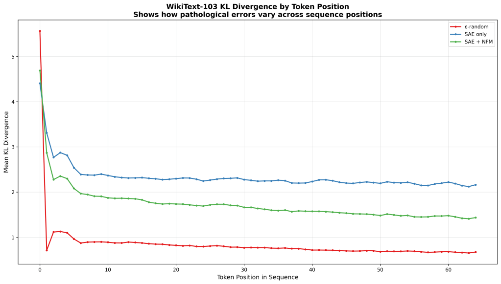In my somewhat biased and limited view currently, this points to the pathological errors not being about reconstruction quality alone but missing computational structure in the LLM layer that capture computational relationships. Non-linear feature interactions still has to be established as meaningfully contributing (this version only is made of about 4.5% non-linear interactions) to the KL divergence reduction.