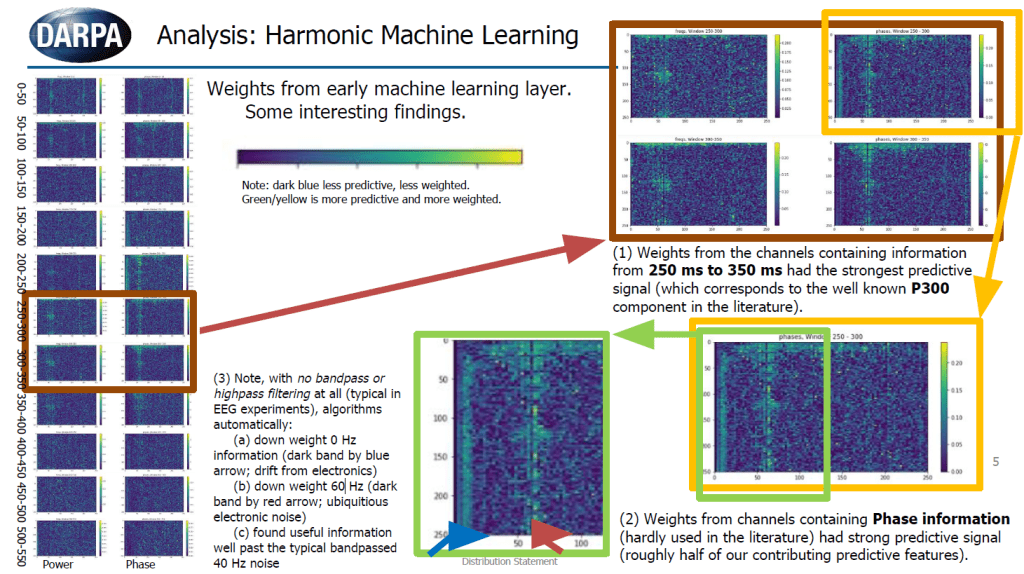 - 250-400 milliseconds shows a bunch predictive weights for frequencies ~35-80 Hz (and sub-bands, ~40-60 Hz) which corresponds to the traditional ‘P300’ for discrimination tasks, but automatically found, with a lot more nuance.