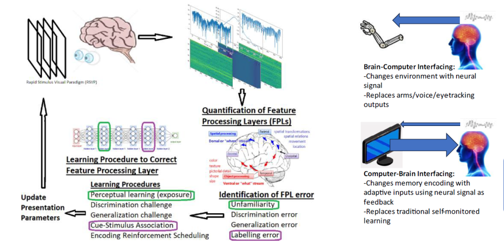 - Successful demonstration of the fundamental research will enable a path forward by which higher levels of human processing can be bypassed, and rote memorization and routine training can be conducted rapidly using single-trial FPL signals from wearable neurotechnology. Our lower level perceptual systems can operate in excess of 100 Hz for detection of perceptual familiarity, upwards to 20 Hz for target detection, group identity, and semantic labelling. Our higher-level metacognition systems operate much slowly. While these metacognition systems useful in our dynamic day-to-day environments and novel problem solving situations, this system is highly irrelevant and outdated for the vast majority of personnel training and student memorization that still occurs in our military, schools, and workforce. Being able to directly read-out the FPLs is a transformative capability that will enable the building of rapid, adaptive visual presentation software that will allow successful ‘programming’ of them, enabling greatly accelerated memorization, training, and learning. Successful transformative technology that accelerate human learning is one of the largest force-multipliers government, military, business, and academics can work on for national and human progress.